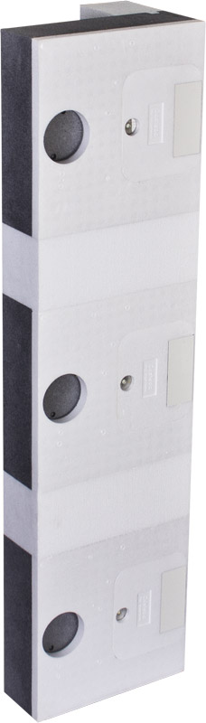 Description K3-SW avec isolation d'embrasure Les éléments pour fixation des gonds K3-SW avec isolation de l'embrasure se composent de trois éléments pour fixation des gonds K1-SW, contrecollées avec deux pièces intermédiaires en polystyrène expansé de 15 kg/ m³, complétées des deux côtés par un panneau isolant de 10 mm d'épaisseur en laine de pierre. Les éléments pour fixation des gonds K3-SW avec isolation de l'embrasure peuvent être utilisés du côté gauche et du côté droit. Les éléments pour fixation des gonds K1-SW se composent d'un panneau isolant en polystyrène expansé blanc de 30 kg/ m³. La surface de façade ainsi que la surface d'embrasure sont contrecollées avec un panneau isolant de 10 mm d'épaisseur en laine de pierre. Dans l'évidement rectangulaire, sont collés deux tôles perforées en aluminium, un panneau compact et une pièce découpée en polystyrène extrudé. Deux fraisures supplémentaires sont prévues pour le cheville pour panneaux isolant et pour la douille taraudée et filetée jointe à la livraison. Pour chaque élément pour fixation des gonds K1-SW, deux rondelles en laine de pierre et une douille taraudée et filetée sont jointes à la livraison. Dimensions